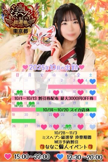 『踊りませんか?悲しみを捨てて』『踊りませんか?痛みを忘れて』 🎤Aile The Shota 2人の呼吸を合わせて踊るようにぬるぬるしましょう 本日の受付は終了していますご予約ありがとう今月は明日でラストです明日のダンスパートナー様も募集中です 明日、月曜日の次は金曜日!いつも出勤してる水曜日はお休みになりますお気をつけを~  10月はシフトが変則的です個人イベントもするのでよろしくねぇ  🎊『ミス.ヘブン総選挙 2025』に出場決定WEB予約をして頂くと皆さまからの票が2倍、3倍になります(何故だー)皆さまのエロき1票をよろしくお願い致します↓詳細はコチラhttps://www.suika-g.net/suika/girl/403/blog/2068922.html  10月のイベントhttps://www.suika-g.net/suika/girl/403/blog/2072471.html https://lit.link/nanako75suika月間スケジュール、各種SNSやサイトはこちらから姫予約は『ヘブンのトーク』『XのDM』『LINE』でお受けしています