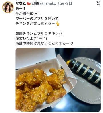 最近胃袋がブラックホール!すぐお腹空いちゃうななこが通りますよ~ 夜ご飯を食べても深夜にお腹って空いちゃいません? 昨日もスイカから帰ってね、夜ご飯を食べたんですよからあげ~  味噌汁も作って王道な夕食 でもご飯てぇ2時間くらいで消化されちゃうからぁ 昨日もやってしまいました   あー!手が勝手にー!ウーバーのアプリを開いちゃう~! マックって、いつも頼むものは決まってて バーガーのセット(大体ダブチ、絶対コーラ)バーガー単品(大体フィレオ)ナゲット15pパイ(大体アップルパイ) 分かってますよ…一般よりちょっと頼むの多いって…そうです…それですぐにお腹空く燃費が悪い お金のかかる女です 『流石にナゲットは全部食べんよ?でも5pは足りんくない?余ったのおやつにするじゃん』 と弁明したこともあるけれど共感を得たことは1度もありません えぇ…5pじゃ足りなくない…? もう燃費が悪いのは諦めているのでせめてウーバーを自重したいなと家にあるものでささっと健康に良さそうなものを食べる と思っているのに ウーバーが便利すぎて!!!深夜に手が勝手にポチー👆っとしてしまうのを意志の弱い私は止められません 先日も4:00くらいに韓国チキンをポチってしまって👆  キンパ大好き!美味しい ぐぬぬ 明日からは健康的に食べる! 健康!健康大事! 年末年始の飲み会暴飲暴食にも気をつける! 多分私の胃腸たち環境がブラックすぎて泣いてると思う頑張って消化したら次が来るんだもん     【WEB予約リニューアル】ご予約ご希望日の1週間前から2日前までご予約がお取りできるようになりました🎉前日、当日は不可となります ご予約操作 可能時間帯ぬ.き.な.び 10:00~22:00シティ.ヘブン 12:00~22:00 よろしくお願い致します   https://lit.link/nanako75suika月間スケジュール、各種SNSやサイトはこちらから 姫予約は『ヘブンのトーク』『XのDM』『LINE』でお受けしています ○ご希望の日時○ご希望のコース時間○ご予約に使いたいお名前○スイカや私とのお遊びの有無 を一度に送っていただくとスムーズです