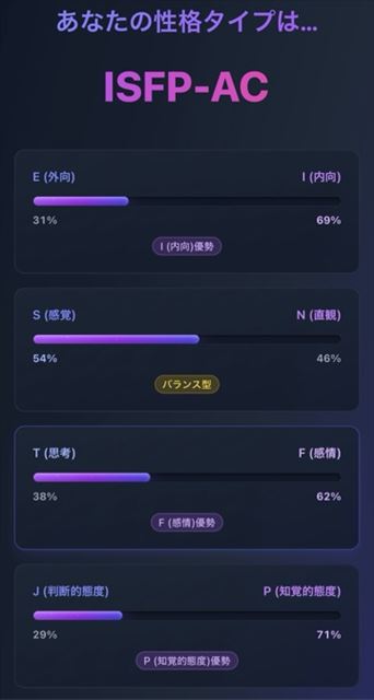 もう世間では当たり前になった性格MBTI診断 最近では面接や誰にどの仕事を任せるか、組ませるかまでMBTIを参考にしてる企業もあるみたいですね でもアレだけ細かく質問されるんだもん!その人の人間性が出るのも納得しちゃいます☝️ その16タイプのMBTI診断がねさらに64タイプに分かれると知ってわたくし ななこ 改めて診断してみました またまたたーくさん答えたよMBTIタイプはいつもと変わらずの【ISFP 冒険家】  感覚マイペース派の陰キャですかね このS(感覚)かN(直感)かのところがいつも真ん中くらいなので【INFP 仲介者】にもなりえるんじゃないかなぁと自分では思っています(どっちにしろ陰キャです) 今回の診断では【ISFP】がさらに4つ分かれて【ISFP-AC】が私の診断結果だそうです  自分の意見は持ってる協調型のようです 確かに私、人数が増えれば増えるほど自分から喋ったりしないかも“なんでもいいよ 決めていいよ 合わせるよ”タイプです 自分の意見も言うけど他人が自分と同じ考えになって欲しいとも思ってないので 基本あんまり主張しないかな “私はそうは思わないけどあなたのそういう考え方もあるんだね” に落ち着く私がすごく苦手なのがディベートを見ることです(参加なぞ絶対にしない) 自分では合ってる気がするけど…どうかな?皆さまが思うななこ像はどうでしょうか?  もっともーっと細かく分析されてるのでななこを知ってやろうじゃないか!って人は【ISFP-AC】って検索してみてね(ちなみにラブタイプは【FCPE 忠犬ハチ公】です) 皆さまは何タイプなんだろう?ななこと相性いいと嬉しいなぁ   【WEB予約リニューアル】ご予約ご希望日の1週間前から2日前までご予約がお取りできるようになりました🎉前日、当日は不可となります ご予約操作 可能時間帯ぬ.き.な.び 10:00~22:00シティ.ヘブン 12:00~22:00 よろしくお願い致します   https://lit.link/nanako75suika月間スケジュール、各種SNSやサイトはこちらから 姫予約は『ヘブンのトーク』『XのDM』『LINE』でお受けしています ○ご希望の日時○ご希望のコース時間○ご予約に使いたいお名前○スイカや私とのお遊びの有無 を一度に送っていただくとスムーズです