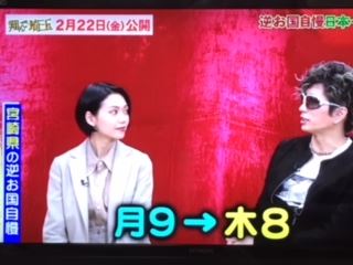 夜中に翔んで埼玉の公開記念番組がやってた。逆お国自慢とか言って宮崎県の事やっていたけど、宮崎県って、民放が2局しか放送されてなくて、なんと月9が木曜日の8時にやっているらしい。だから、大分や熊本、鹿児島の隣接している人達は宮崎県の人とTVの話が成り立たないんだってさ。あーらー。って感じですね。iPhoneから送信