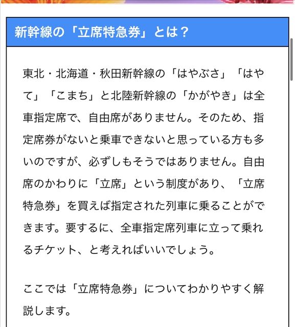 新幹線関連のTwitter見てた時に「立席特急券」というワードが。初めて見聞きした言葉だったので調べてみた。立席特急券とは、全席指定しかない新幹線の指定席が売り切れた場合のみ登場する、席のない切符みたいです。数量が限定されているみたいで、ある一定枚数売れると、買えなくなるみたいですが混雑期を除けばなかなかそんな事態にはならない様ですが。私は全席指定の新幹線って、指定席売り切れたら乗れないから、年末年始は切符早めに買わないといけないから大変だなぁと思っていましたが、やっぱりそういう制度があったんですね!iPhoneから送信