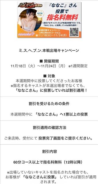 出勤しております~18日(火)~24日(月)まで指名料無料のキャンペーンやってます!!スイカから「ななこさん」がミスヘブン本戦に出場しております(^^)そんなななこさんに清き一票を投票して頂くとどの女の子をご指名の場合でも指名料が無料となります♪♪12時以降で60分コース以上の縛りはありますがせっかくのチャンスなので是非ご利用くださいませ(*^^*)本日もご予約、ご来店心よりお待ちしております☆女の子ページへ http://365diary.net/TEFqN2pRL3R0L3N1aWthLzI4Nzc2NTQy