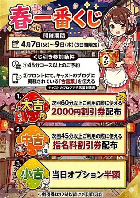 またまたちかです~多分、恐らく、いや絶対ご案内乗り遅れてると思います(´-`)4月のイベントのご案内です(^^)4月7日(火)~9日(木)まで一番くじなるものがあるそうです。45分以上のご予約で女の子のブログに書いてある合言葉をフロントで受け付けの時に言うとなんか色々当たるそうです(^-^)テキトーですいませんwwせっかくだからご都合あえばご参加ください♪♪合言葉「ラッキーちか」で。恥ずかしかったらご無理なさらずに☆女の子ページへ http://365diary.net/T0FBVFNBL3R0L3N1aWthLzI4Nzc2NTQy