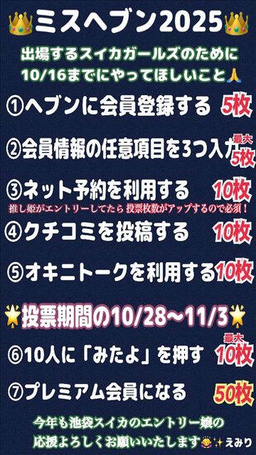 ミ○ヘ○ンのチケット枚数に応じて割引が使えます! 登録してる方は最低でも指名料分は割引になるので、頑張ってログ インして枚数が確認できるページを受付に提示してくださいミ○ヘブ○にスイカガールズが今年もエントリー応援よろしくお願いしますみんなに満遍なく投票してね!えみり女の子ページへ http://365diary.net/UGZMTG1vL3R0L3N1aWthLzI4Nzc2MjIw