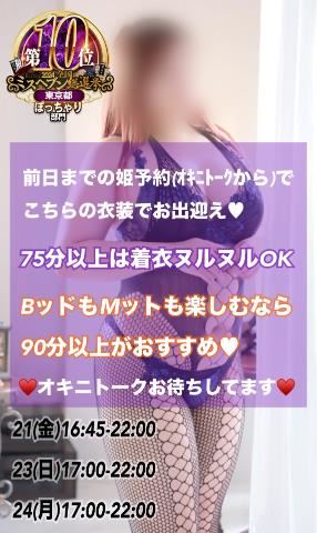 ???本日も仲良しさんたちありがとうございました?次回出勤は明後日の23(日)です!23(日)、24(月)と出勤したら女の子休暇に入ります。来週末よりご予約取りやすいと思うので、逢いに来てくれたらとっても嬉しいです前日までに姫予約(オ〇ニトークから予約)してくださった方にボディタイツでお出迎えしてますこの機会に沢山愛でに来てください???24日まで指名料無料イベント!投票もよろしくお願いします????トークわかる方はそちらにお礼します??Oさんお仕事頑張ったご褒美に!(本当におつかれさま)贅沢ウィーク満喫しててよかったですそして今日は私に会うためだけにわざわざ東京までありがとういっぱいちゅーしてチャージできた美味しいケーキ食べれてますようにまたタイミング合う時逢いに来てねいつもありがとうTさんいつもより長い時間でありがとう大悶絶マッサージもありがとうわたしばっかり気持ちよくなっちゃって幸せ者だわぁわたしたちにマンネリなんてこないよいつもテレパシー感じて駆けつけてくれてありがとねまた来月~暖かくして、加湿して休んでくださいね本日もおつかれさまでしたえみり?女の子ページへ http://365diary.net/cVdUcGI1L3R0L3N1aWthLzI4Nzc2MjIw
