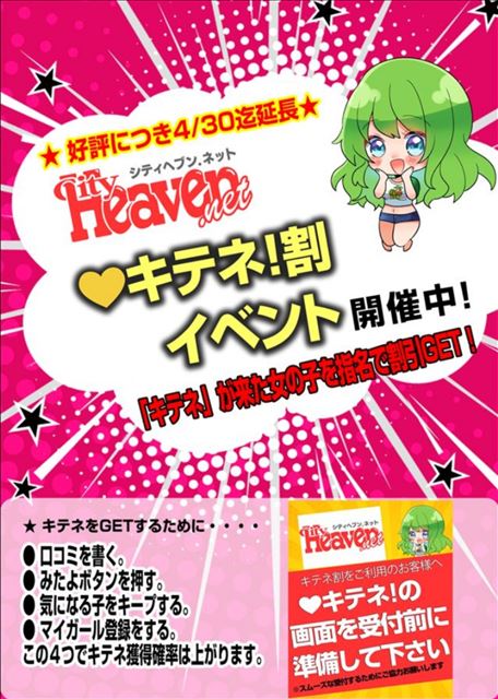 2月13日〜3月31日まで開催されている、 シティヘブンと絡めたスイカのイベント 「キテネ割」!!  この度、延長が決まったそうです  4月30日まで延長しますよ ここで「キテネ割」のおさらい。   シティヘブンの会員様宛に 女のコから「キテネ」(っていうのがあるんだよ)が届きます キテネが届いた女のコを指名すると割引ゲット そういうイベントなのです。   「キテネ」が届いた子なら誰でもOK!なんと本指名の女のコにだって適用されます 全コースに適用されます 他の割引との併用が可能!割引を組み合わせて安く遊ぶことかできます    ただし、注意事項も! 午前中のコースには使えません!割引を使いたいかたは午後からお願いします 割引を使う際はキテネの画面の確認をさせていただきます。スクショはNGです   そんな感じです  シティヘブンの登録がまだのかたはぜひ登録もしてね つばさの場合はシティヘブンでしか読めないブログなんかも書いてます  オキニトークもやり取りできるようにしてるので お問い合わせ、事前予約なんかも受け付けています  なにとぞ…