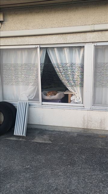 観光地! その土地の食べ物! とかではないんですが 個人的に萌えたので。  人ん家ですいません。(あ、ちゃんと断り入れてる) ちゃんと猫ちゃんのためにカーテンあけて景色見せてあげてるの素敵。  眼光鋭し。