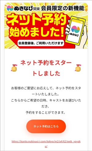 お店に出勤してるときって お知らせしたいことがなかなか書けずにいたりします。 (昨日のシティヘブン総選挙のこともそう)   なので このお休みのタイミングでお知らせを。  ぬきなび関東でWEB予約がスタートしたそうです。  ぬきなび関東のWEB予約、 前日から予約ができるんだそうです。    シティヘブンのWEB予約は前日予約不可で当日の朝10時から、 2時間以上先の予約からの受け付けとなりますが、   ぬきなび関東も当日予約に関しては シティヘブンと同じ条件のようです。   電話はなぁ…ってかた、よろしければご活用くださいませ。