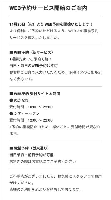 昨日のア◯トーークはハガキ職人芸人でしたね あれを観るとラジオを聴いてみたくなります。 最近聴いてないなぁ、ラジオ。   わたしもものすごーく昔、 ラジオではないんですが 某テレビ番組の視聴者のお便りコーナー的なやつに投稿して読まれたことがあります。 なんの内容で読まれたのか昔すぎてあんまり覚えてないのですが  投稿者の名前を ペロペロチンチーノ にしたことだけは覚えています。   名前ですべってますね!! (でも読まれました)    おはようございます つばさです 昨日はリクエストの関係でイレギュラー&ロングな1日でしたが、本日は早番つばさで参ります。  10時〜17時まで。 ↑いただいてるご予約に支障のない形で本日のスタート時間を少々遅らせています。  空いてるお時間、スタート時間を遅らせてる以外は昨日お知らせしたものから変更ありません。  【本日の空き時間】 10時〜11時15分 13時45分〜17時  このあと朝8時から当日予約の受付が開始されますのでお時間の合うかたからのお誘いをお待ちしております  25日(火)からWEB予約の方法が変わります!!  電話予約は変わらず、前日と当日のご予約が可能です  それでは、 本日もよろしくお願いいたします