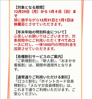 年末年始のお休みのタイミングでスイカに行っちゃおうかな〜 とお考えの皆さまにお知らせです。 このたび、スイカでは12月29日(月)〜1月4日(日)まで年末年始の特別料金をもうけることになりました。 (12月31日(水)と1月1日(木)はスイカの年末年始休み)   ホームページの新着情報にも載ってますが この期間は全コース+1000円となります。  この期間でわたしの出勤予定は 12月29日(月) 12月30日(火) 1月3日(土) になるかと思います。  上記の日にちでご予約、ご来店を考えてる皆さまはご注意ください