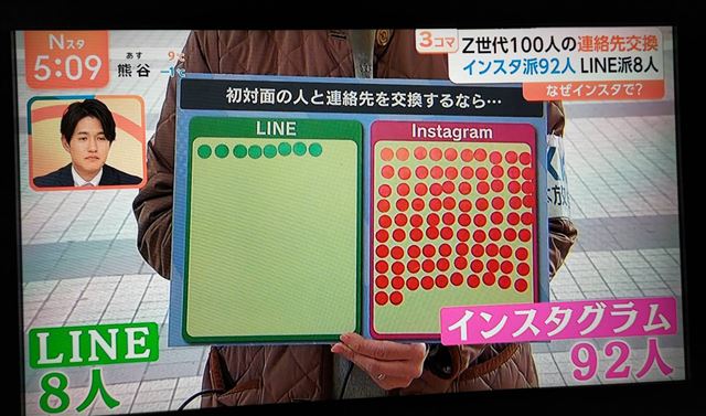 今日見た夕方のニュース。  Z世代が初対面で連絡先を交換する場合どっち?の投票、こんなに差がある! わたしなんてインスタは読み物ツールと化しているというのに。    ブログ書くのが苦手というか嫌いというか… そんな人間ですので プライベートのSNSはアカウントだけ作って一切こちらから何かを発信することはありません(笑)