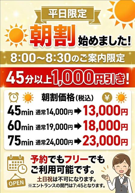 昨日は(昨日も)お休みで せっかくだから最後の桜でも見ておこうと思ってたはずなのに  デーゲームで推し球団の試合を観て ネトフリで配信が始まった「九条の大罪」をイッキ見してたら1日が終わりました。  九条の大罪、単行本で数冊読んだことがあるので内容は知ってましたがドラマ面白!! バイオレンスなシーンはとっさに「ひい!!」「痛い!(←痛くない)」とかつい口をついて出ちゃうので映画(館)とかじゃなくて良かったです。    引きこもりで終わった休暇最終日ですが、根が引きこもり属性なので大変リフレッシュできました。   本日からスイカさんに参ります。 そしてスタート時間がいつもより少々遅めです。 10時〜17時まで。   【本日の空き時間】 11時15分〜17時  ご予約、ありがとうございます お会いできるのを楽しみにしていますね  このあと朝8時から当日予約の受付が開始されますのでお時間の合うかたからのお誘いをお待ちしております  それでは、4月最初のスイカさん よろしくお願いします    平日限定で朝割が始まったそうな。 わたしは8時台出勤ではないので対象ではないのですが…もし、8時台に行かれるかたがおりましたら。