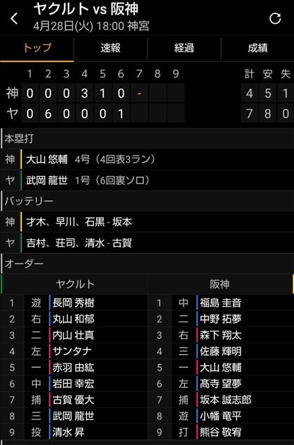 お家に帰って さぁ〜試合どうなってるかな〜? と、観てみたら 6点も取られていました(白目)   これは…才木くんやってもうた? 少しずつですが点を返せてる分、まだ救いがありますね! ただ… 近本いないの痛いし、 中野くんまでベンチ下がったし、 もうこれ以上怪我人は…   あと、平日だというのに国立競技場では何のLIVEをしてるんでしょう?