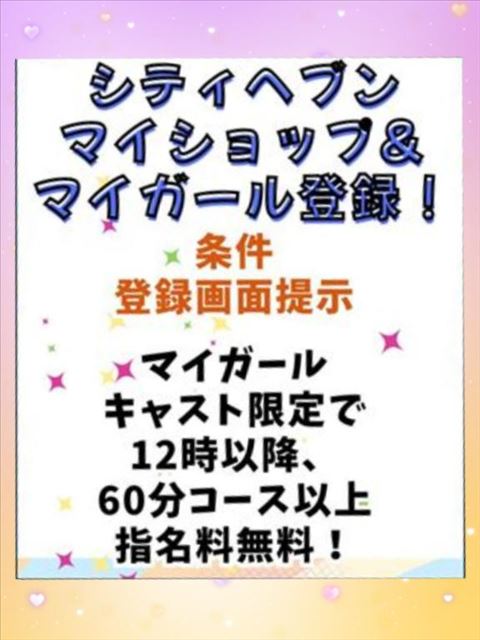【シ.テ.ィ.ヘ.ブ.ン】マイショップ&マイガールの両方を登録マイガール登録した女の子の指名料無料期間:9月1日(月)~9月5日(金)※12:00以降60分コース以上※受付で登録画面の提示 女の子ページへ http://365diary.net/M1ZlbVhwL3R0L3N1aWthLzI5NjQxMzUy