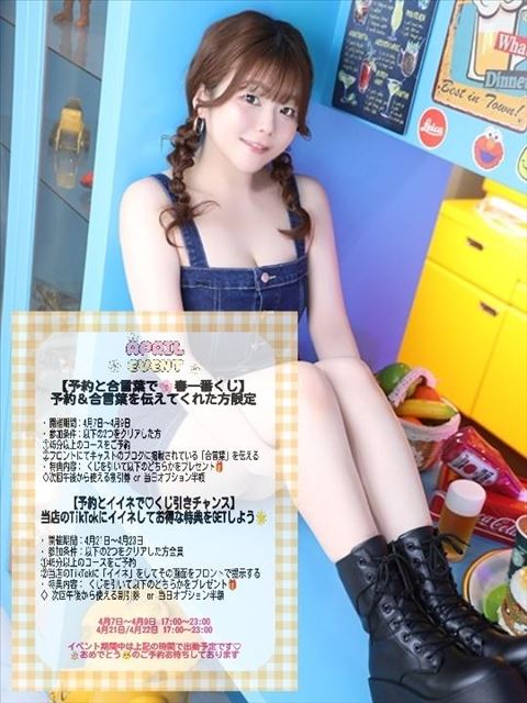 【予約と合言葉で?春一番くじ】予約&合言葉を伝えてくれた方限定? 開催期間:4月7日~4月9日? 参加条件:以下の2つをクリアした方①45分以上のコースをご予約②フロントにてキャストのブログに掲載されている「合言葉」を伝える? 特典内容: くじを引いて以下のどちらかをプレゼント?◇次回午後から使える割引券 or 当日オプション半額【予約とイイネで?くじ引きチャンス】当店のTikTokにイイネしてお得な特典をGETしよう?? 開催期間:4月21日~4月23日? 参加条件:以下の2つをクリアした方全員①45分以上のコースをご予約②当店のTikTokに「イイネ」をしてその画面をフロントで提示する? 特典内容: くじを引いて以下のどちらかをプレゼント?◇ 次回午後から使える割引券 or 当日オプション半額【イベント期間中の出勤】4月7日~4月9日?4月21日/4月22日全て17:00~23:00で出勤予定です①姫予約 ②WEB予約 ③電話予約ご自身の都合の良いものを利用してね!ちな姫予約がいちばん嬉しいです??女の子ページへ http://365diary.net/b0FPQmJNL3R0L3N1aWthLzI5NjQxMzUy