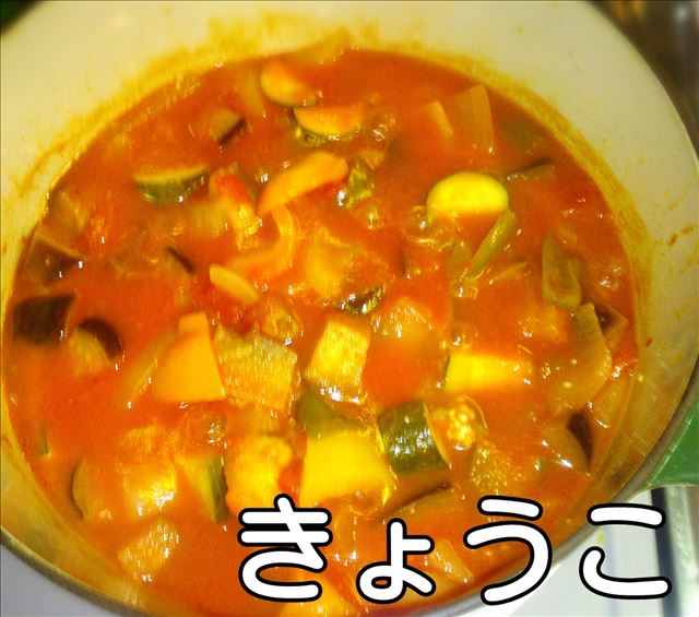 こんばんは    今日採ったナスとズッキーニを使って ラタトゥイユを作りました  刻んだ野菜とトマト缶を煮込むだけ。  お野菜たっぷり摂れる楽ちん料理です      明日は 09:30 ~ 16:00 出勤します  よろしくお願いします     慣れない労働で疲れたから もう寝るっ  おやすみなさい