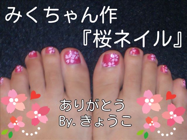 今日も たくさんのご来店ありがとうございました   トマト大盛況 な感じ~      前回 出勤した時に、遅番 みくちゃんに あんよのネイルアートをしてもらいました   その日の夜に ここでお礼とご紹介しよか思ってたのに 忙しくて 遅くなっちゃいました   私もみくちゃんも大好きな 桜です すごく細い筆で 一枚一枚 花びらを描いてくれました。 みくちゃん、器用だなぁ
