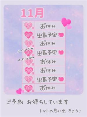 こんにちは。三連休中の 22日(日)に会いに来てくださった皆さん、どうもありがとうございました。無事 朝の待機だけで満了してほっとしましたw ありがとう(´∀`*)I王子、サプライズもいいけど、約束して 待ち遠しく思いながら待つのもなかなかいいんだよね♪意固地なカラダ。と 簡単に噴き出す王子。笑…いつも楽しいっす(*´艸`)ww初ご指名 Yさま、まずは色々と下調べをしてからのご来店に感謝ですねw しかし さすがの懸賞金つき!手強く力及ばす…残念でしたが、また今度もきょうこ流で攻めさせてください(^∇^)おかえり Kさま、ホント出勤ごとに会えるのうれしいです!今回はお時間も長くしてくれてありがと^^*指定通りのお土産も、思いがけない大容量に驚きつつも確実に胃袋に納めてますよ笑次回は“みんな大好き105分”にしてください!守護神 Kさま、ラスト枠埋めてくださる貴方とは、やっぱり守護神、貴方様でしたかw いつもその行動力には惚れぼれします。本当にありがとう!ずっしり重たいケーキ、今日いただきます^^*次の出勤予定は、24日(火) 10:00からです。今月はあと(火)(木)(日)と出たら終了です。どうぞよろしくお願いします。・:+° 女の子ページへ http://365diary.net/U0ZmeHR4L3R0L3RvbWF0by1zaGluLzc5NzMxNDA-