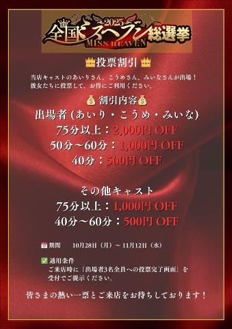 こんばんは。お疲れさまです。今日 会いにきてくださった皆さん、どうもありがとうございました。Tさん、待ってたよ~^^ 出会ってから今まではほとんど間をあけずに来てくれてたから、すっごく待ちわびてたんですよ。変わらず優しく可愛がってくれて ありがとう!Fさん、まさか 今月2回もお会いできるとはっ!!Fさんの“一番...”になれて うれしい♪もっともっと病みつきになってくれても構いませんよ~笑 またお時間作ってね!今日は 今月のラスト出勤でした。10月お会いできました皆さん、どうもありがとうございました来月もよろしくお願いいたします今度の日曜日はお休みをいただいておりまして、、次の出勤予定は11月6日(木) 10:00~17:00 です。ミスヘブン総選挙の投票期限は11/3 (祝・月) 23:59迄です?トマトなびの3人に投票してね~そして 割引き使って遊びにきてね~(投票割りは11/12迄)どうぞよろしくお願いします。・:+°?女の子ページへ http://365diary.net/OXlzSnphL3R0L3RvbWF0b25hYmkvMzkyMDA2Mzc-