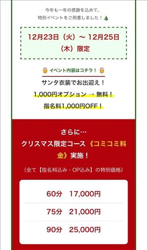 クリスマスイベントのお知らせです?★期間: 12/23(火)~12/25(木)★内容:・サンタコスでお出迎え?・指名料1000円OFF?・1000円のオプションが無料?★限定メニュー: 指名料+オプションこみこみの特別価格でご案内?・60分→17000円・75分→21000円・90分→25000円???お得にみなと遊んでね?女の子ページへ http://365diary.net/alF3bjBOL3R0L3RvbWF0b25hYmkvNDkwODIzNzk-