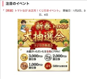 お得なイベントのお知らせです????★開催期間1月2日(金) ~ 1月4日(日)★内容・期間中にご来店いただいた全てのお客様が参加可能!・ハズレなしの必ず当たる特別くじ引きです?1等 3,000円割引2等 2,000円割引3等 1,000円割引4等 500円割引★ご利用に関する注意事項・チケット使用可能期間1月13日(火)~ 2月28日(土)・割引チケットの利用詳細は券面をご確認ください。・ロングコース等の場合は、総額料金からの割引適用となります。女の子ページへ http://365diary.net/dEpRSExRL3R0L3RvbWF0b25hYmkvNDkwODIzNzk-