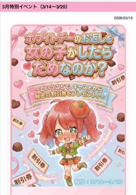 ホワイトデーイベント、明日が最終日です?????イベント期間2026年3月14日~3月20日??イベント内容期間中にお遊びしていただいたお客様に、女の子から直接【秘密の割引券】をプレゼントします????使用期限2026年4月1日~4月末日女の子ページへ http://365diary.net/Wkg5VGY2L3R0L3RvbWF0b25hYmkvNDkwODIzNzk-