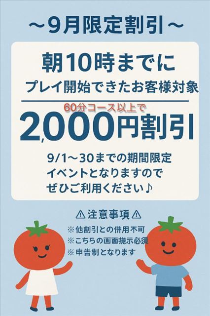 毎度おなじみお得情報も貼っときます( ᴖ , ᴖ ) 8:00~10:00までに遊べる方限定!! 10:00~だったら何分コースでもOK🤗🌷 私は10:00スタートなので是非🩷 ※10:20~とかだと対象外なので 是非こちらも早起き得意な方は ご利用してみてね🥰 Koume🪄.⋆◝✩   女の子ページへ http://365diary.net/cWROaGpFL3R0L3RvbWF0b25hYmkvNTYxNDQ4OTI-