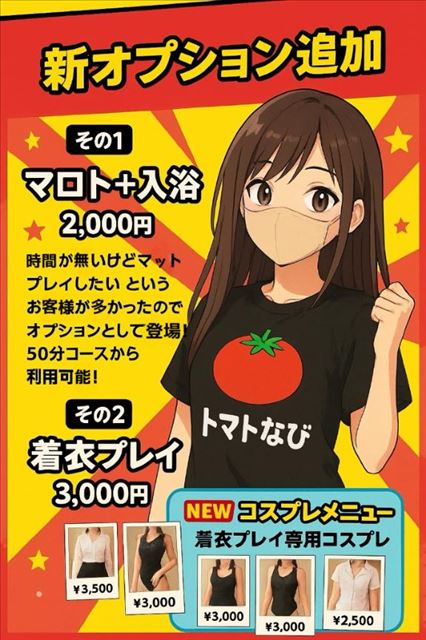 普段日記書かない人がめちゃくちゃ アップしてます🫡 ✩ ⋆ ✩ ⋆ ✩ ⋆ ✩ ⋆ ✩ ⋆ ✩ ⋆ ✩ - ̗̀📢朗報🍅 オプション2個追加されました✌🏻 【マッ〇+入浴】 +2,000円 時間が無いけど〇ットプレイしたいという お客様が多かったのでオプションとして登場👏🏻 50分コースから利用可能💓 【着衣プレイ】 +2,500円~ 念願の着衣プレイ😽🍒 全部で5種類👕👚 ⚠️数量限定商品 通常レンタルコスはお出迎えとかお帰りのみ なので、結構楽しめるかも(˶՞・֊・՞˶) ぜひオプション着けて一緒に 楽しも🥰 Koume🪄.⋆◝✩   女の子ページへ http://365diary.net/RklabGV2L3R0L3RvbWF0b25hYmkvNTYxNDQ4OTI-
