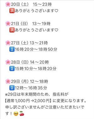 急なブログ連投失礼します??年内の出勤日程が確定したので、空き状況と併せてお知らせさせてください?年末、一緒に過ごしてくださるお兄様を大募集中ですそして、朝からサイトを開いていただく負担を減らしたくて始めたトークからの事前ご予約ですが、実際にご好評いただけていてとっても嬉しいですあと、お兄様が優しいメッセージを送ってくださるのでさくらが幸せになれます笑ただ、先の予定を早めに決めていただくことが、かえって負担になる方もいると思うので、何かご意見がございましたら是非教えてください!?しばらくの間は、ご予約も、プレイのご相談も、その他なんでも、引き続きトークから大歓迎です年末はさくらとなことで締めくくってくださったら嬉しいですよろしくお願いいたしますさくら女の子ページへ http://365diary.net/bGNwWm1GL3R0L3RvbWF0b25hYmkvNjA3NDA1ODc-
