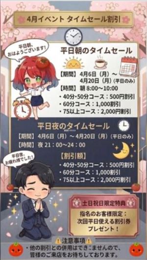 ?4月限定 タイムセール割引のお知らせ?いつもご利用いただきありがとうございます。日頃の感謝を込めて、お得なタイムセールを開催いたします!【タイムセール詳細】対象期間:4月6日~4月20日(※平日のみ)対象時間:朝 8:00~10:00 / 夜 21:00~ラスト期間中の該当時間にご来店いただくと、コースに応じて以下の割引が適用されます。?割引内容?・40分、50分コース:500円割引・60分コース:1,000円割引・75分以上コース:2,000円割引?土日祝日ご来店のお客様へ特別プレゼント?土日祝日に【みさき】をご指名いただいたお客様限定で、「次回以降の平日に使える割引券」をプレゼントいたします!??注意事項??・他の割引との併用はできませんので、あらかじめご了承ください。・受付時にこちらの画面をご提示ください。お得なこの機会にぜひご利用くださいませ。皆様のご来店を心よりお待ちしております。女の子ページへ http://365diary.net/ZEJtMjBsL3R0L3RvbWF0b25hYmkvNjUxOTE4OTE-