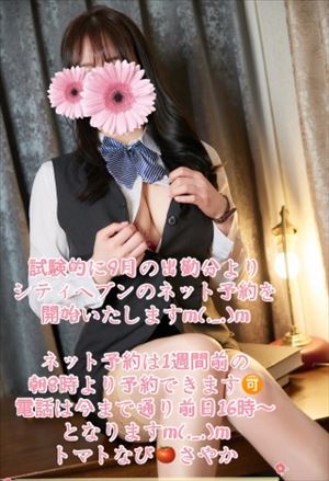 試験的にではございますが9月の出勤分より シティヘブンのネット予約を開始する運びとなりました ネットだと電話をかける事なく遊びに来ていただけて さらに、1週間前から予定を立てていただけます  現在ネット予約だけの割引コースなども 是非シティヘブンに登録していただきマイガール登録などもしていただきネットでのご予約を活用してみてくださいませ そんなに難しいことはありませんたぶん   登録はこちらから↓https://www.cityheaven.net/tokyo/A1305/A130505/tomatonabi/girlid-17500921/    女の子ページへ http://365diary.net/QkZVU0NqL3R0L3RvbWF0b25hYmkvMTc1MDA5MjE-