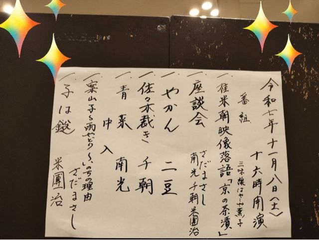 本日のスケジュール     早起きしてお料理完成させる   陶芸のバザー出品の午前のお店番する   母と軽めのランチにいく   贅沢な落語会を堪能する   持ち寄りのお家飲み会に参加   という怒涛の楽しい一日でした   充実です   落語会は座談会あり 貴重な映像あり 特別ゲストのさだまさしさんの歌あり   素晴らしかった   出囃子が関白宣言なのには会場が沸きました           女の子ページへ http://365diary.net/M0p2TXJEL3R0L3RvbWF0b25hYmkvMTc1MDA5MjE-