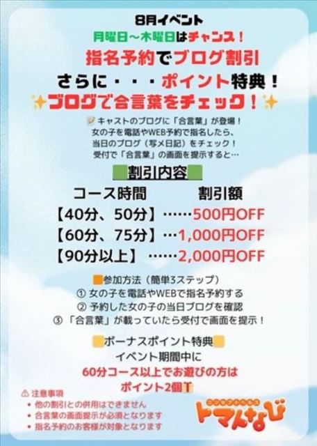 明日から8月のイベント始まります8月は全てのコースでお得なイベントとなっておりますぜひご予約くださいませ8月の月曜~木曜は【ブログ割イベント】を開催!電話、WEB予約で指名した女の子の当日ブログ(写メ日記)に記載されている「合言葉」を受付時に画面提示すると、受付時に最大2,000円割引になります。 ▼割引内容 40分/50分コース → 500円割引 60分/75分コース → 1,000円割引 90分以上のコース → 2,000円割引 さらに!期間中60分以上のコースでご利用のお客様には、 【ボーナスポイント】もプレゼント! 60分以上のコースならポイント2個進呈。女の子ページへ http://365diary.net/eHZPSnhoL3R0L3RvbWF0b25hYmkvMTc1MDA5Mzc-