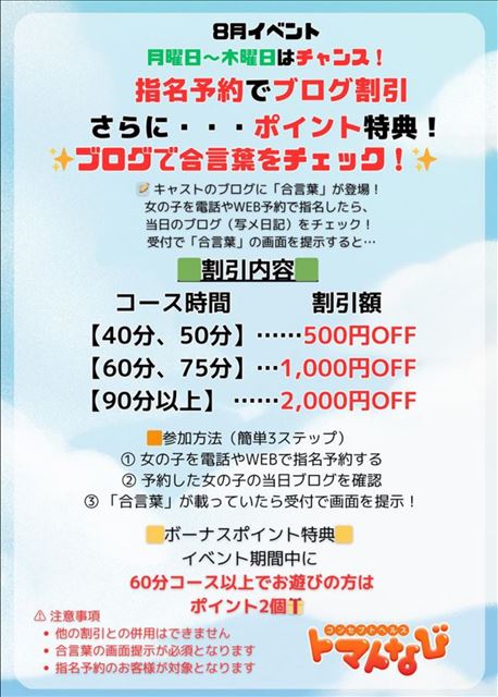 現在なびでは【合言葉割引き】のイベントを開催中~ 8月は毎週月~木までイベントしてるよ~ん 本日の合言葉は【あっちっちtime】   受付時にこの画面を提示するだけで40分コース以上から割引きありーーーーーーー 是非ともご活用くださーい   さらに~ イベント期間中はボーナスポイントでスタンプのプレゼントあり スタンプカードをお持ちのみなさまは忘れずに提示してくださいね~ スタンプカードをお持ちでない方はこの機会に作ってみては   今回はその場で割引ができちゃうからこのお得なイベントは来なくちゃ損だよー    LINE予約ができるようになりました~お友達登録して気軽に予約してください(当日の朝8時からLINE予約可能です) http://line.me/ti/p/olC8SVNdq2クリックしたらLINE画面だよ  前日予約は電話のみとなります事前に予約していただけると  X(旧Twitter)@hana_tomatonavihttps://twitter.com/hana_tomatonavi?s= 21 TwitterのDMより一週間前から事前予約が可能です  シティヘブンhttps://www.cityheaven.net/tokyo/A1305/A130505/tomatonabi/girlid-23309280/ マイガール登録みたよクチコミとーっても喜びます