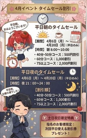 🌸4月限定  お得なタイムセール🌸 朝と夜の時間帯で割引ありのイベントです😊✨ 🌤️平日朝のタイムセール 【期間】4月6日~4月20日(平日のみ) 【時間】8:00~10:00 朝から来てくださるお兄さまに嬉しい特典❣️ ・40分 / 50分コース → 500円OFF ・60分コース → 1,000円OFF ・75分以上 → 2,000円OFF 🌙平日夜のタイムセール 【期間】4月6日~4月20日(平日のみ) 【時間】21:00~24:00 お仕事終わりのご褒美にぴったり❣️ 割引内容は朝と同じ😋 ・40分 / 50分コース → 500円OFF ・60分コース → 1,000円OFF ・75分以上 → 2,000円OFF ぜひお得に遊んでください🥰     女の子ページへ http://365diary.net/M3dJc0lUL3R0L3RvbWF0b25hYmkvMjQ3ODk5MzE-